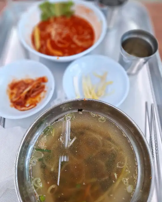 제가 주문한 것은 단연 이 집의 시그니처라 할 수 있는 비빔국수입니다. 붉은 양념 소스는 단순히 색감을 넘어, 입안에서 펼쳐질 매콤함의 잠재력을 암시합니다. 이곳의 비빔국수는 쫄깃한 면발과 아삭한 채소가 조화롭게 어우러진다는 평가가 많았습니다. 제가 직접 경험한 면발은 기대 이상으로 탱글탱글했습니다. 이는 전분질이 열에 의해 호화(gelatinization)되면서 형성되는 탄력성이, 최적의 시간 동안 삶아졌음을 의미합니다. 섣부른 조리는 면발의 구조를 파괴하여 흐물거리게 만들지만, 이곳의 면발은 그 정도를 완벽하게 조절했습니다.