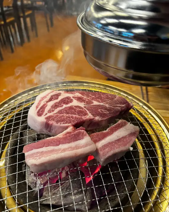 불판 위에 고기를 올리는 순간, ‘치익-‘ 하는 소리와 함께 맛있는 냄새가 확 퍼졌어요. 숯불 향이 배어들면서 고기가 익어가는데, 그 비주얼이 정말 예술이었죠. 두툼한 목살과 삼겹살의 자태를 보니, ‘이거 보통 고기가 아니구나!’ 싶었어요.