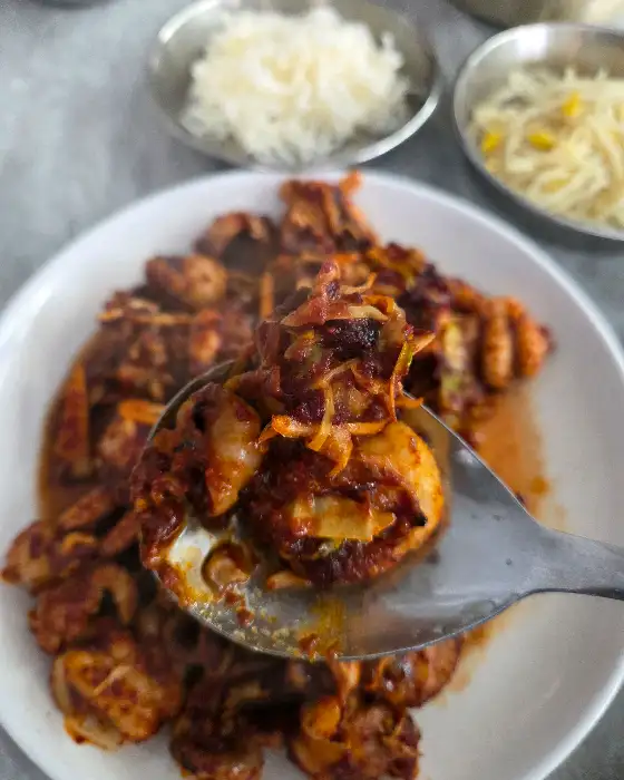 먼저 쭈꾸미볶음의 외형적 분석에 들어갔습니다. 160도 이상의 고온에서 단백질과 당이 반응하는 마이야르 반응 덕분에, 쭈꾸미 표면은 보는 것만으로도 침샘을 자극하는 먹음직스러운 갈색 크러스트를 형성하고 있었습니다. 붉은 양념은 단순히 색감을 넘어, 다채로운 향신료와 고추장의 복합적인 화학 반응을 통해 만들어진 결정체라는 것을 직감했습니다. 쭈꾸미의 질감은 신선도를 가늠하는 중요한 지표인데, 탄력 있는 탱글함은 살아있는 생물에서 볼 수 있는 최상의 상태를 증명하는 듯했습니다.