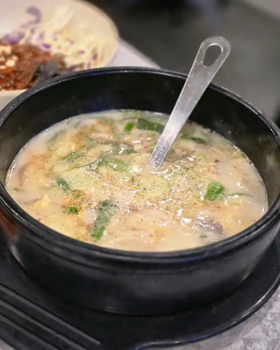 이곳의 또 다른 매력은 바로 서비스 메뉴야. 족발을 주문하면 기본으로 ‘술국’과 ‘막국수’가 나온다는 사실! 이게 또 별미 중의 별미야. 술국은 한우 사골을 우려내 진하고 깊은 맛을 자랑하는데, 보기만 해도 속이 풀리는 기분이었어.